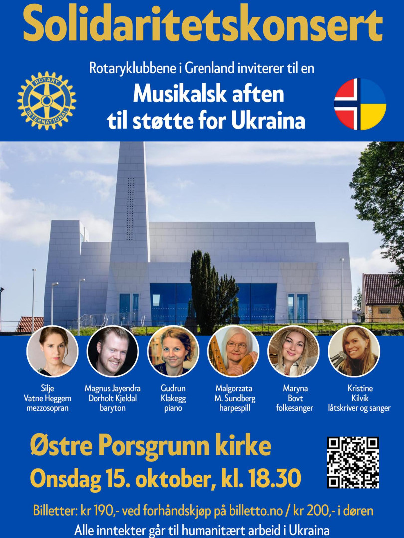 Det ukrainske orkesteret Dzvinha – med tjuefem banduraspillende og syngende ukrainske kvinner, mange gode vokalister – reiste fra 5. til 18. april rundt i Sør-Norge og holdt konsert på 14 steder. 17. april var de i kulturhuset Ælvespeilet i Porsgrunn. De viste at banduraen kan brukes til alt fra ukrainsk folkemusikk via Joe Dassin, Albinoni, Bach, Grieg, a-ha til Mykola Lysenkos opera «Natalka fra Poltava» og Ukrainas nasjonalsang «Sjtsje ne vmerla Ukrajina», som betyr «Ukraina har ikke gått under». Det var norske rotaryklubber som inviterte Dzvinha til Norge, og alle inntekter fra konsertene går til innkjøp av mobile nødhjelpsklinikker. Rotary Norge har til nå finansiert tolv klinikker og er på veg med den trettende. Internasjonalt er målet hundre klinikker innen utgangen av 2024. Prosjektet kan støttes på Vipps 131109. Rotaryklubbene i Skien, Porsgrunn, Brevik og Langesund stod for konserten i Ælvespeilet. Sissel Berit og Espen Hoell fra Langesund RK var med Dzvinha på hele turneen og har informert publikum om Rotarys arbeid.